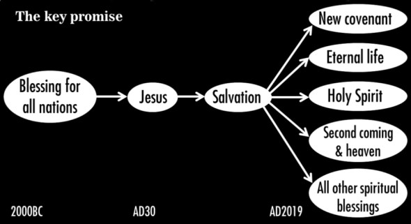 It’s a key promise because it is the original messianic promise (see Appendix A) and it is the source of the other promises. Paul said, “All praise to God, the Father of our Lord Jesus Christ, who has blessed us [believers] with every spiritual blessing in the heavenly realms because we are united with Christ” (Eph. 1:3NLT). The spiritual blessings that we are promised are consequences of our faith in Christ. So they were included in the original promise. The diagram shows God’s plan of salvation over a period of at least 4,000 years: the promise was given to Abram in about 2,000BC, Jesus died about AD 30 and we live in AD 2019. That’s the big picture.