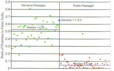 There were two exceptions to this Hebrew verb pattern. Exodus 33 (with a ratio of 0.18), which contains a large number of future references that are indicated by the use of the imperfect verb form. And, Ezekiel 19 (with a ratio of 0.47), which is an apocalyptic passage and describes kings of Judah with highly figurative language. Genesis 1:1 – 2:3 has none of the features of these two passages.