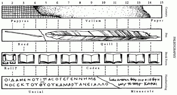 The characteristics of these documents changed over the centuries between when they were first composed and the advent of the printing press. The media they were written on changed from stones (like the Ten Commandments), to clay tablets (Moses), to papyrus (paper made from a reed plant that grew along the Nile River – that’s where our word paper comes from), to parchment (also called vellum; made from animal skins), and to paper. Paper as we know it was invented in China, but wasn’t used in Europe until the 1200s. Books replaced scrolls in about the second century AD. In about the eleventh century AD, the Greek text changed from modified capitals to lower case. In about the fifth century AD, the quill replaced the reed as the “pen” used by copyists. Scholars examine these characteristics when dating manuscripts.